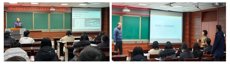 黄弢主任分享了《面向智能制造开放自动化实践教学与AI探索》主题报告,从新工科背景下工程控制与检测课程实验开放自动化探索与创新、《TwinCAT机电控制与检测实验教程》编写思路和课程实验安排、基于倍福PC架构开放自动化理念,以及以此构建的EtherCAT实验平台等方面由浅入深地介绍了实验教育理念与教学方法,特别强调了如何兴趣引导学生“学中做、做中学”,为与会者提供了宝贵的经验和启示。与会教师就开放自动化实践教学实施路径、AI工具辅助实验教学的方式方法等问题深入交流,气氛热烈。