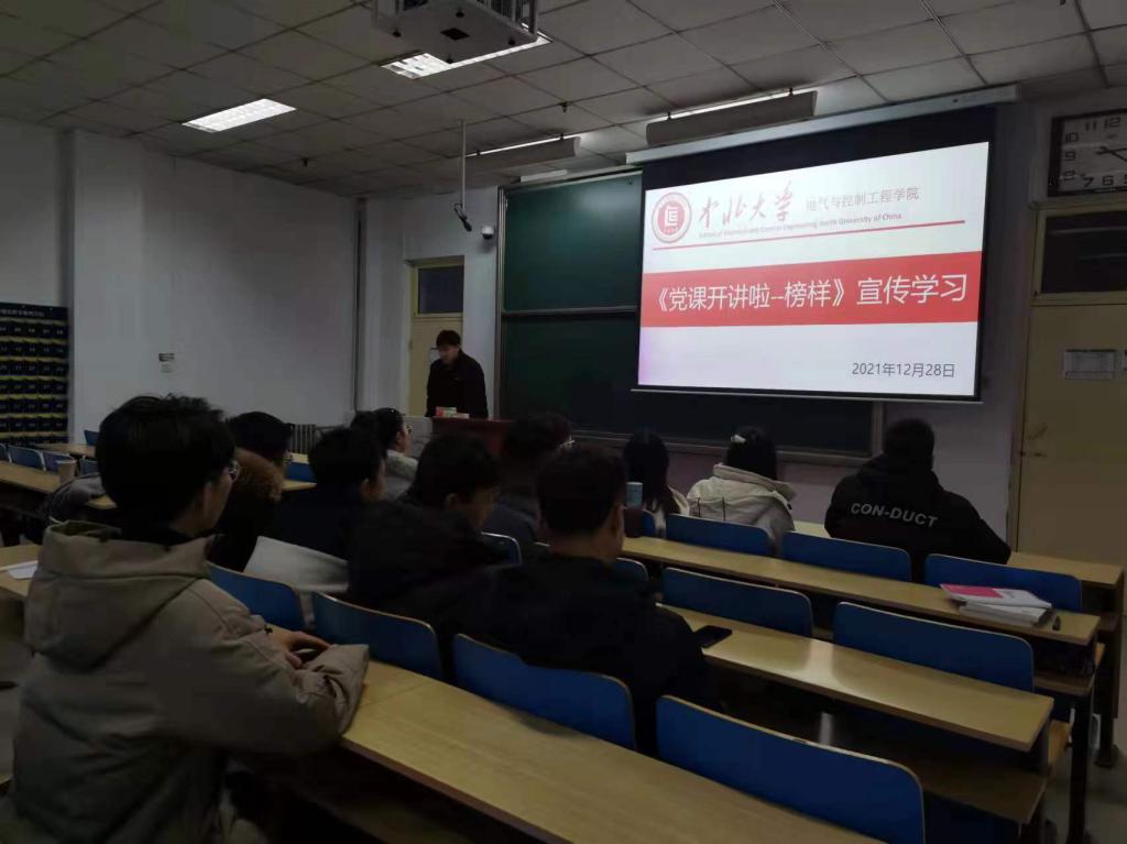 2021年12月28日下午在11111H教室,人妻av 组织全体研究生会成员观看《党课开讲啦——榜样》第二期:《迎春花开》。