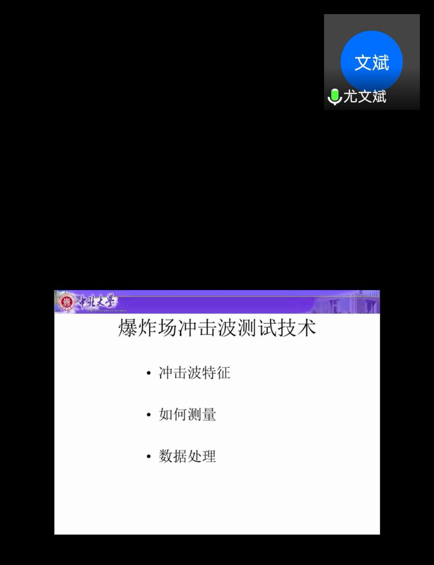 讲座上,尤文斌老师分别从冲击波特征、如何测量及数据处理等方面向同学们讲解了爆炸场冲击波测试技术,介绍了水下爆炸、近地爆炸、冲击波与声波的不同特点及对人的杀伤作用等,并且从多个方面介绍了冲击波信号采集系统。其次,尤老师讲解了测量系统的基本要求及测试系统类型。最后,尤老师向同学们介绍了测试系统的布局和设计,并鼓励同学们多阅读研究相关文献。