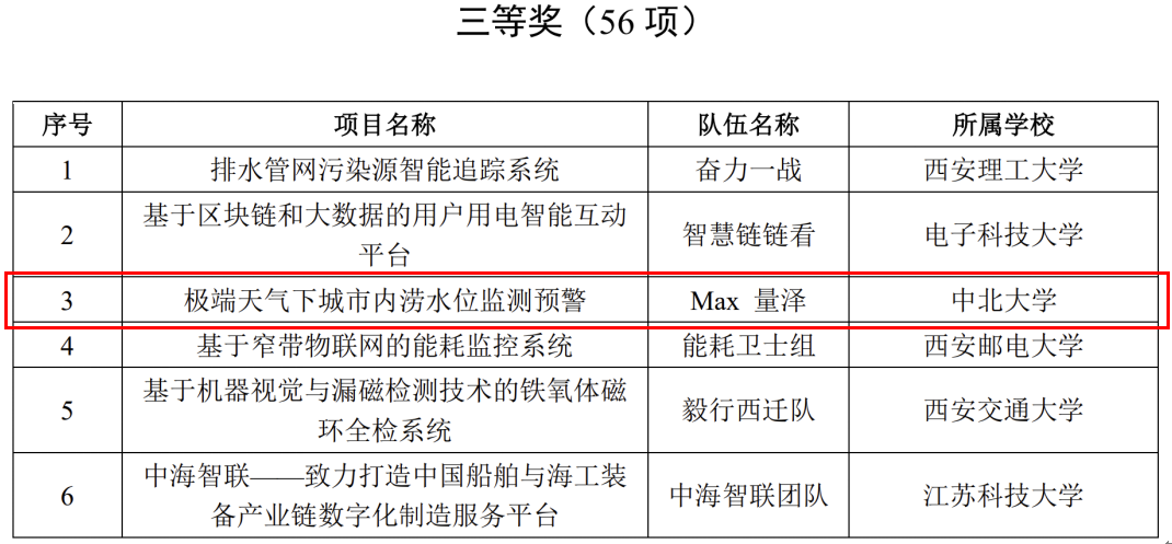 陈昌鑫老师指导,赵振戎、赵亮、张倩茹、杨鑫鑫四位研究生组成的“MAX量泽”代表队,以参赛项目“极端天气下城市内涝水位监测与预警装置”,获得大赛全国总决赛三等奖。项目针对针对极端天气引起断网、断电环境下常规设备易失效所导致的水位信号难以测量需求,综合利用先进传感技术、物联组网技术、分布式测控技术等设计了一种浮子容栅式水位测试装置,提出了ZigBee+NB-IoT物联网传输及光伏-电池供能方案,研制实物模型并验证了极端断网、断电环境下水位监测与预警功能,同时获得了专利授权和学术论文等相关研究成果。