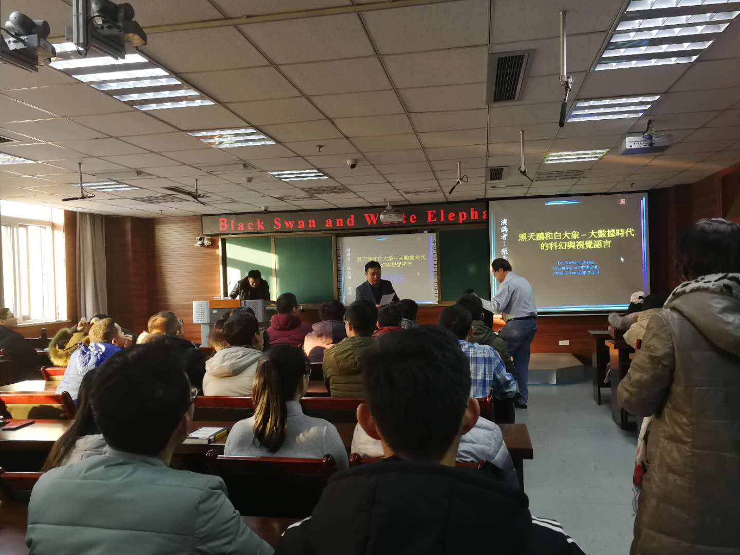 在教学主楼815多功能厅组织了主题为‘黑天鹅与白大象-大数据时代的科幻兴视觉语言’的学术讲座,我们有幸邀请到美国匹兹堡大学知识系统学院院长张系国教授主讲,广大师生到场聆听。