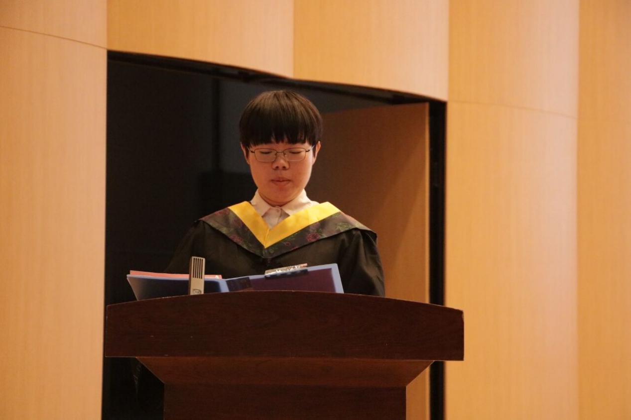 毕业本科生代表田梓颖发言。他感谢四年来学院的栽培、老师的辛勤付出、同学的陪伴已让她从懵懂少年蜕变成建设家国的栋梁。
