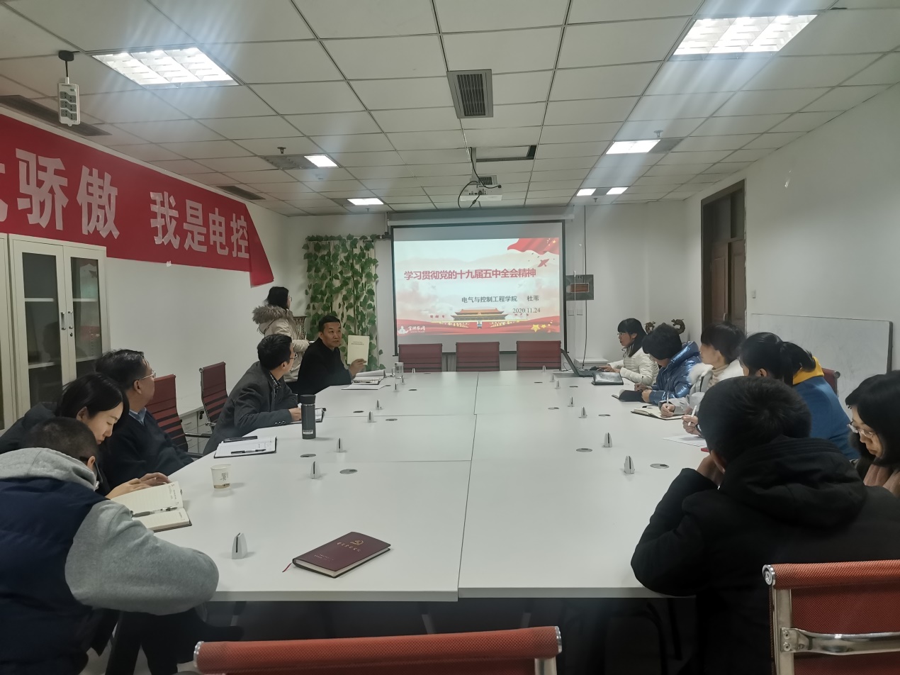 在11号楼619教室召开理论中心组(扩大)会议,集中学习党的十九届五中全会精神,学院党委书记陈晔主持会议。学院领导、党委委员、科级干部、党支部书记相关人员参加会议。