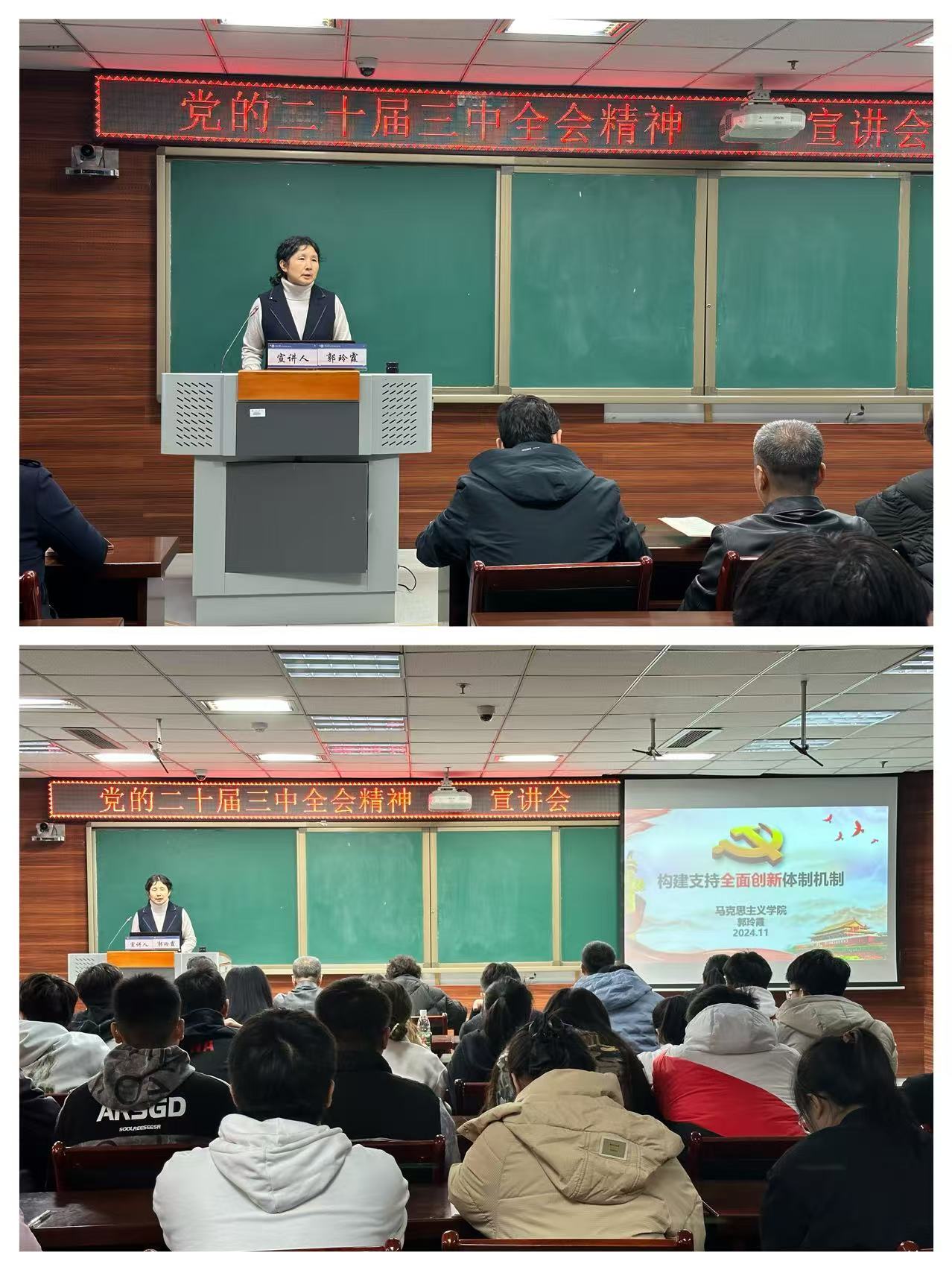 召开了党的二十届三中全会精神宣讲会。此次宣讲会邀请了校内宣讲团思政教师代表、马克思主义学院副院长郭玲霞作为主讲嘉宾,以《构建支持全面创新体制机制》为题为学院师生深入解读党的二十届三中全会精神。学院领导班子成员、师生党员代表参会,会议由学院党委副书记杜瑞平主持。