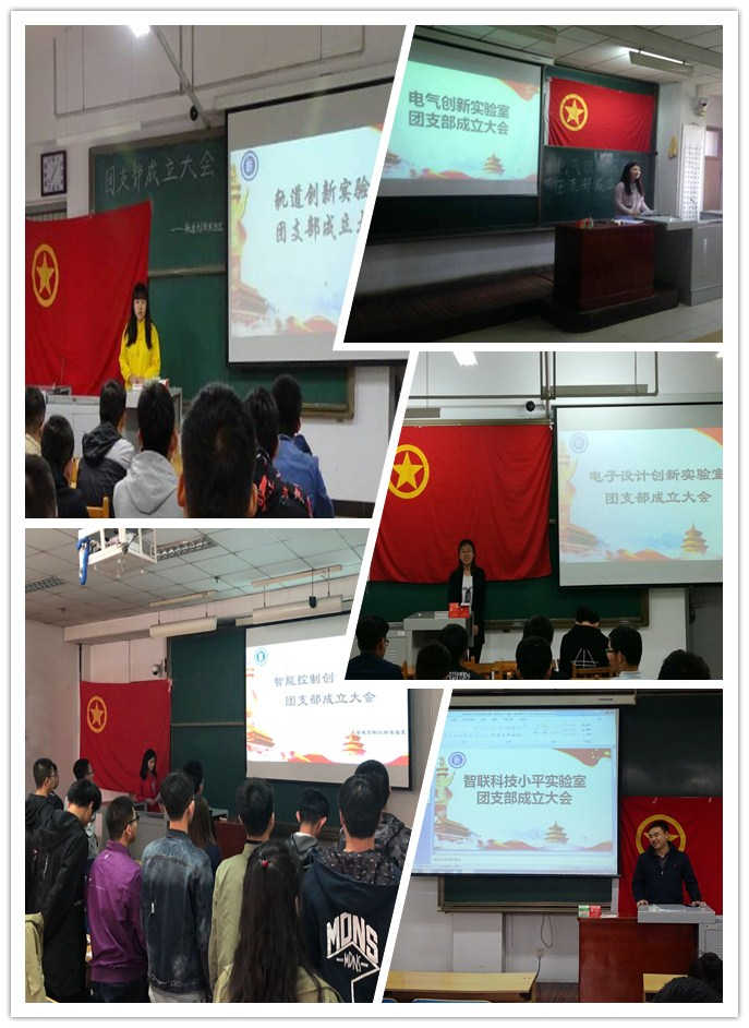五个创新实验室均积极申请成立了团支部:电子设计创新实验室团支部、电气创新实验室团支部、轨道交通创新实验室团支部、智能控制创新实验室团支部以及智联科技小平实验室团支部。2018年4月中旬各实验室相继召开了团支部成立大会,并按照《团的基层组织选举规则》的规定,通过竞选演讲和匿名投票选举产生了各实验室团支部的委员会成员。会后,全体共青团员面向团旗、由团支部书记带领重温了入团誓词。