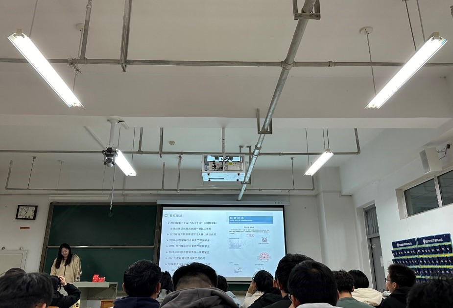 讲座刚开始,王心雁同学向23级新生介绍自己的推免经验以及其大学三年的学习心得,指导大一新生如何在大学中里有一番作为。随后王心雁同学向大家建议积极参与科学竞赛并向同学们分享自己参加竞赛的经历。正是名列前茅的学习成绩和一次次的竞赛经历,让她成功保研到理想的学校继续攻读相关专业。