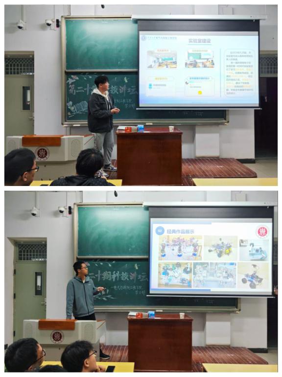 首先,智能控制创新实验室的贾倍豪进行讲解。他首先介绍了实验室的基本情况,实验室由来自不同学院、不同专业的学生构成,形成了多学科交叉融合的创新氛围。他列举了实验室在各项赛事上取得的奖项与成绩,展示了实验室强大的科研实力,让同学们对实验室的优势项目和核心内容有了更深入的了解。