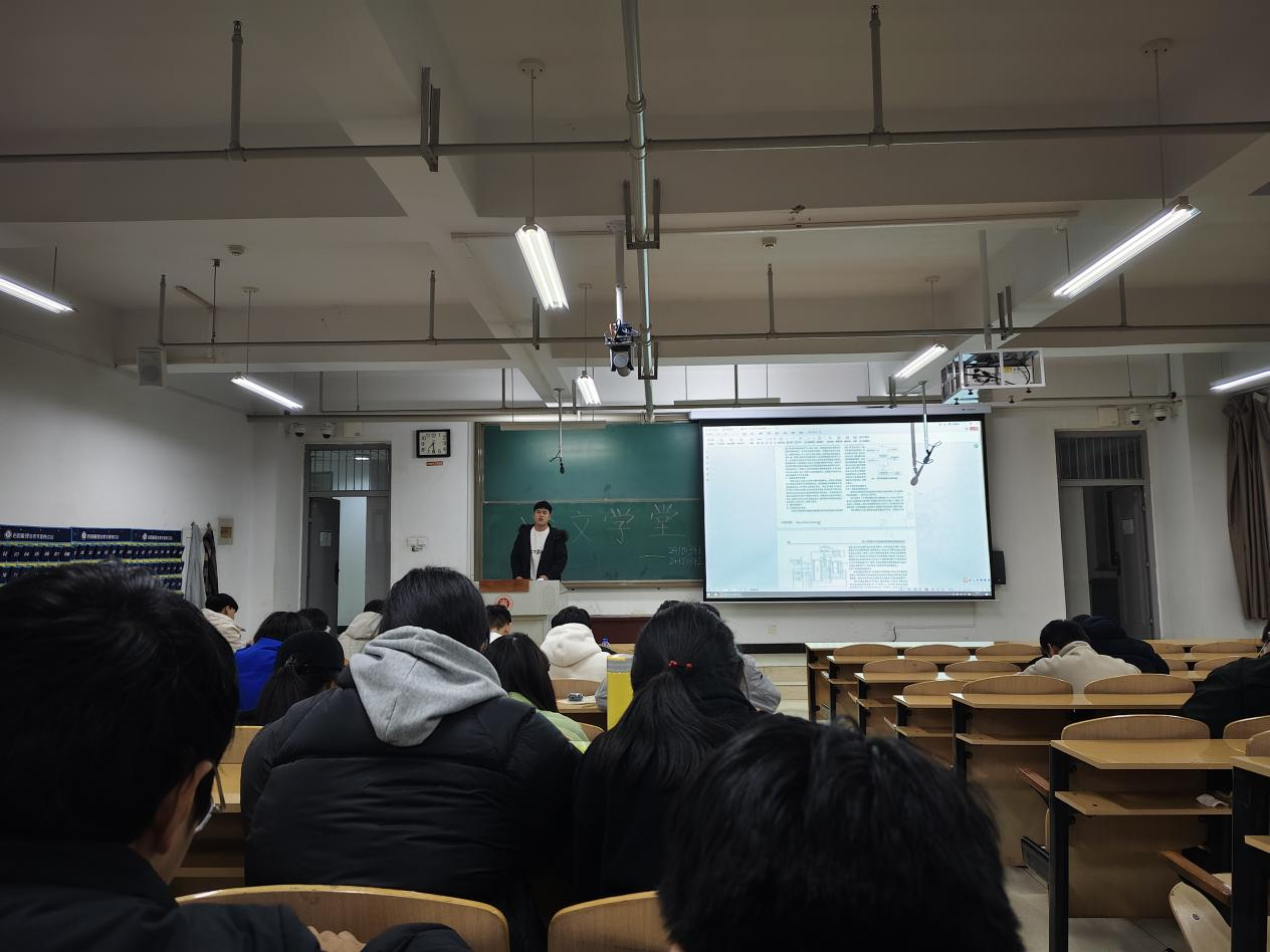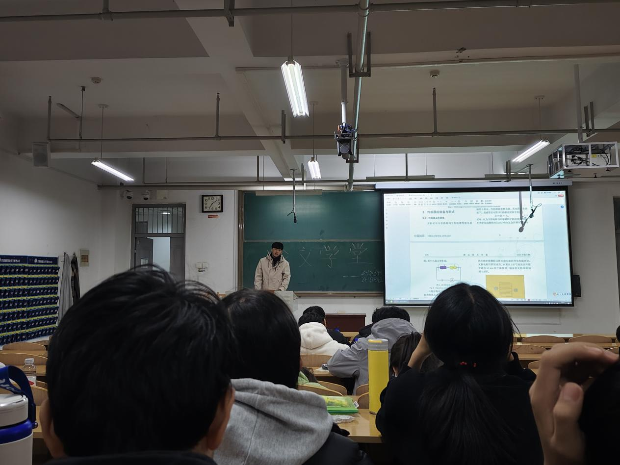 本次论文学堂首先由杨铎进行分享,他分享了论文《基于MXene/RGO复合材料的具有多孔压力敏感结构的柔性可穿戴传感器》,通过本篇论文为同学们讲解了论文的结构,还有研究某一项目的步骤,要根据逻辑结构一步一步进行,然后根据测试结果得出结论。