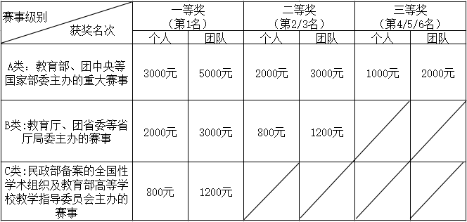 (3)以本科生为最高学历参加省级以上创新创业竞赛并获得奖励的学生,分团队和个人两类按照获奖等级给予奖励,具体奖励标准如下表所示。其中参赛人数2人及以上并获奖的按照团队标准予以奖励。