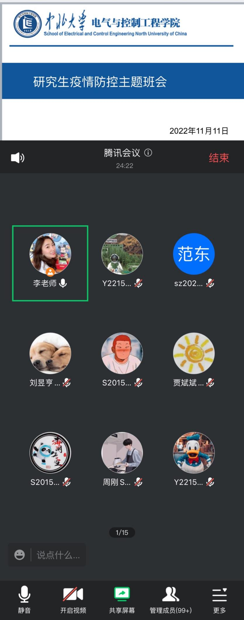 于2022年11月4日(线下)、11月11日(线上)召开了研究生疫情防控主题班会,班会由研究生辅导员李婷主持。