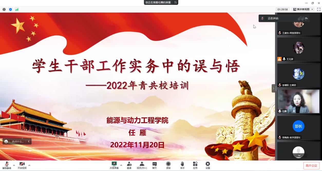 第三节课,能源与动力工程学院党委副书记兼副院长任雁老师以《学生干部工作实务中的误与悟》为题,用亲切平易的话语,结合自己的工作经验,分析了学生干部工作中的误区,并勉励同学们能够敢想敢为、善作善成。