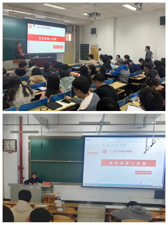 03月16日下午四点,教工第二党支部和教工第三党支部在11511H和15406H教室开展了“党员温暖人生路”专题活动,教工第二党支部书记刘鹏和教工第三党支部书记沈大伟老师主持,20级自动化专业和电气工程与智能控制全体学生和班主任老师参加会议。
