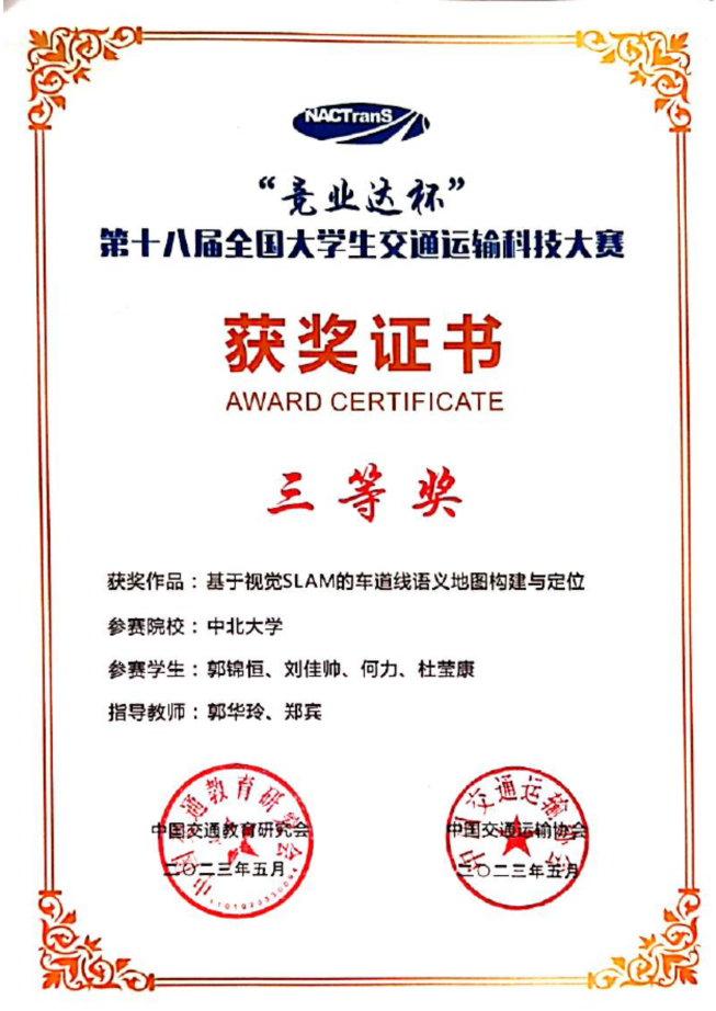 2021级交通运输专业硕士研究生郭锦恒、刘佳帅、何力、杜莹康同学所完成的参赛作品“基于视觉SLAM的车道线语义地图构建与定位”,经过现场答辩和专家评审,获得研究生赛道国家三等奖。这是我校研究生首次在全国大学生交通运输科技大赛中获得国家级奖项。