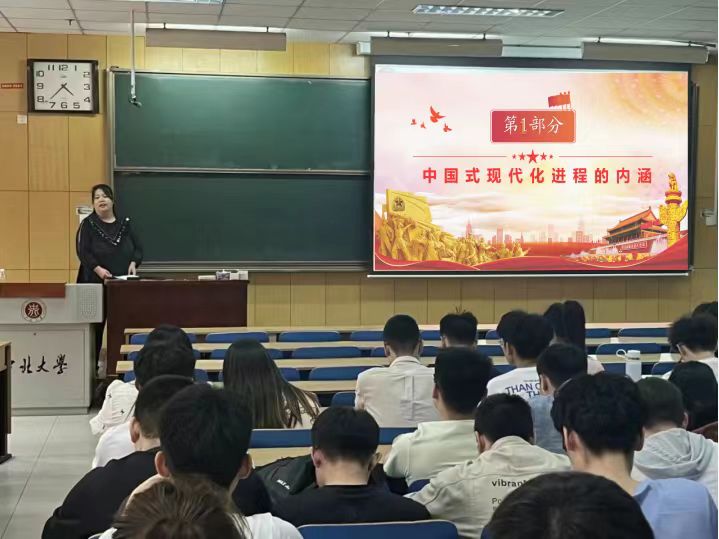 在宣讲会上,薛艳霞老师以《前“晋”的力量,中国式现代化青年当有为》为题,从深刻领会中国式现代化进程的内涵、中国式现代化进程中青年要有担当、以青年的现代化推进中国式现代化、让青春在中国式现代化山西实践中绽放绚丽之花四个方面入手,全面准确地宣讲党的二十大提出的重大理论和理念、重大方针政策、重大工作部署,让全体学生党员同志深刻领悟到党的二十大的重大意义,更加准确把握党的二十大精神的核心要义。