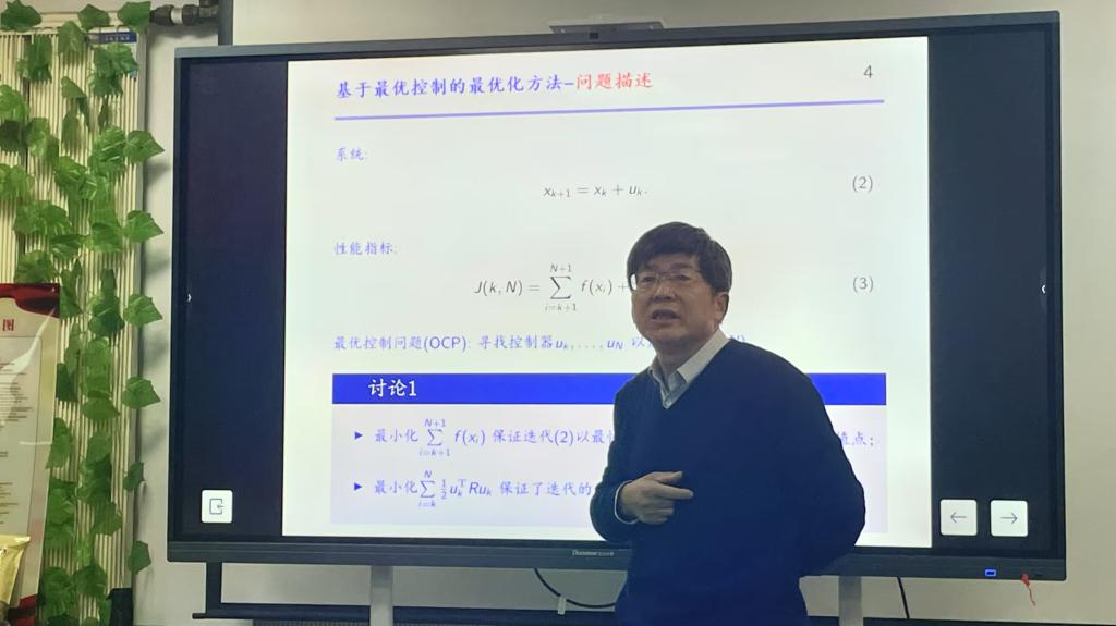 在报告中张教授提出一种既快又稳定的全新优化算法,这一算法的核心思想是最优控制原理。将迭代算法的更新值作为控制变量,设计控制变量使得将来时刻被优化函数值之和以及控制能量之和最小,其中被优化函数和最小保证了算法收敛最快,能量之和最小保证了算法的稳定性。经过泰勒展开,算法进一步简化成迭代算法。严格证明了新的算法的超线性收敛速度。新的算法可退化为梯度下降、牛顿迭代以及改进的加速梯度下降、正则化牛顿算法。报告会结束后,张教授和与会人员进行了最优化方法方面的学术交流与探讨。