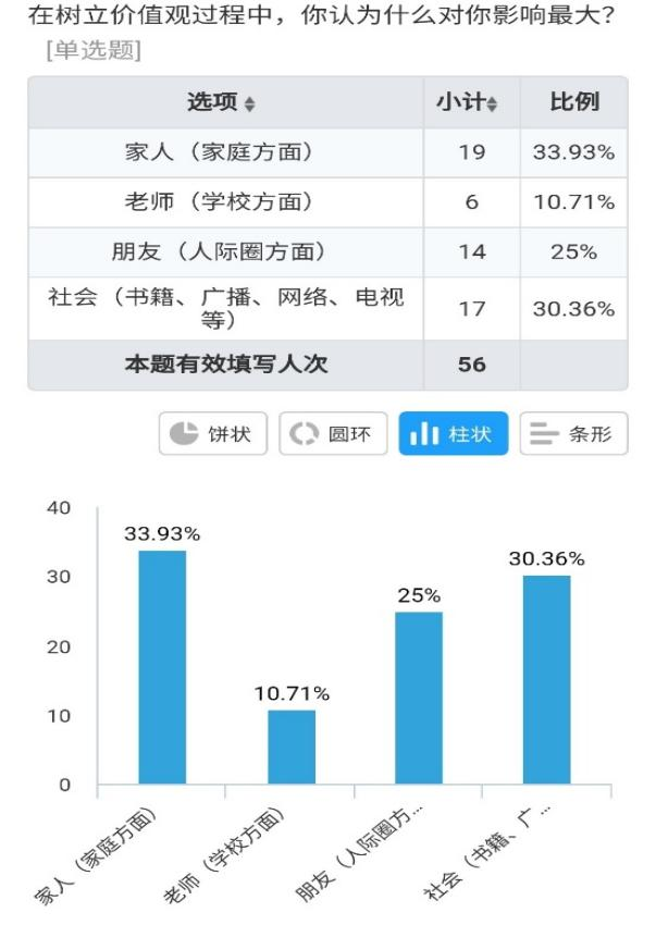 其中,在“再树立价值观过程中,你认为什么对你影响最大”这一问题中,大多数人认为家人,朋友,社会方面对其影响比较大,而其中应该担当主要角色的老师所占比重却意料之外的低,这从侧面说明了义务教育阶段的老师担任的角色更多是知识的传输者,起到的正确价值观引导的作用比较小。