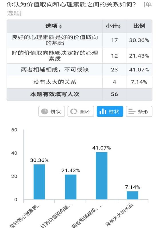 而在“你认为价值取向和心理素质之间的关系如何“这一问题中,7.14%的人认为两者之间没有太大关系,41.07%人认为两者相辅相成,不可或缺,而其余的人则认为两者有先后顺序和因果关系。