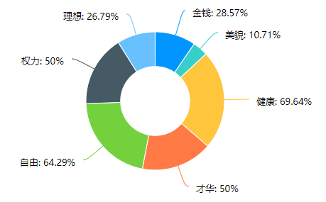 在“你认为的最重要的三样东西中”我们得到了56份问卷,其中占比最多的是健康以及自由,分别占比达到了69.64%和64.29%。其次是才华和权力,占比均达到了50%。美貌的需求占比最低,仅为10.71%。