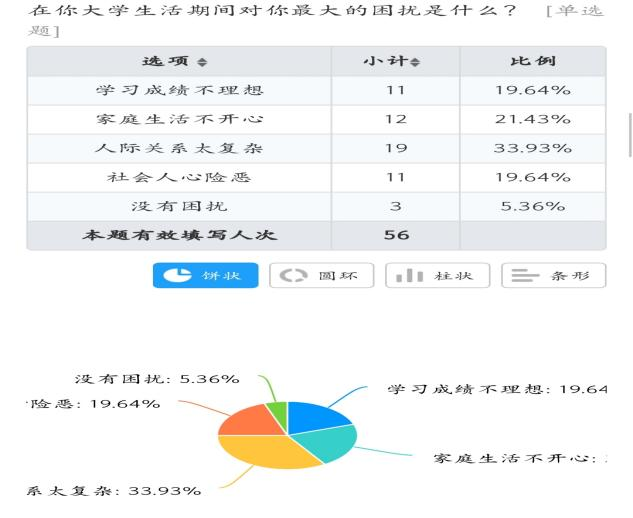 从选择人数上看,“人际关系复杂”占居榜首,“家庭生活不开心”次居第二,随后的是“学习成绩不理想”、“社会人心险恶”。从中我们可以看到,当代大学生们对自己的前途发展是最很重视的,同时也应看到,我们在这方面上得到的帮助不是很充裕,这应该和辅导员的本职工作有关。其次,是“家庭生活不开心”很突出,令人惊讶的是在这方面,这是调查之前没有想到的。说明很多同学不会与家长进行恰当的交流,即便与父母生活过那么多年,仍无法有效的沟通。同学们应该敞开心扉主动去父母进行交流,毕竟父母永远是我们最坚实的靠山。