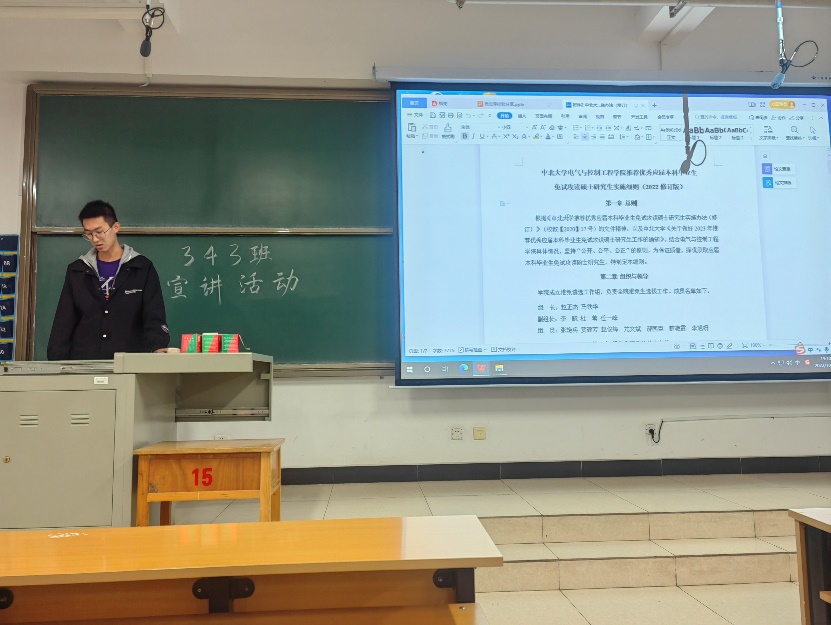推荐优秀本科毕业生免试攻读着实研究生实施办法(修订)》中被推免的条件以及一些加分的细则,其中主要介绍了进行竞赛加分的项目,列举了诸多的赛事如“中国“互联网+”大学生创新创业大赛”、““挑战杯”全国大学生课外学术科技作品竞赛“、“全国兵棋推演大赛”等,并着重介绍了他所加入的自动化实验室,并带领同学们观看了几个实验室的视频。