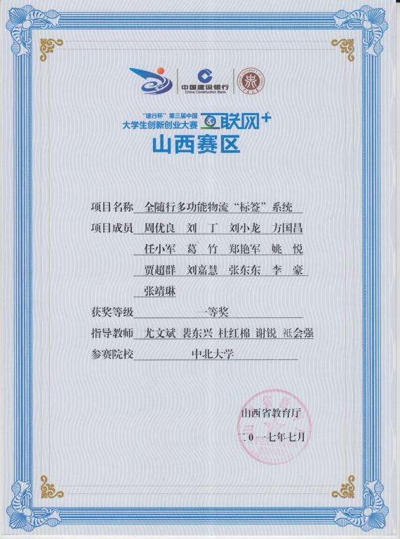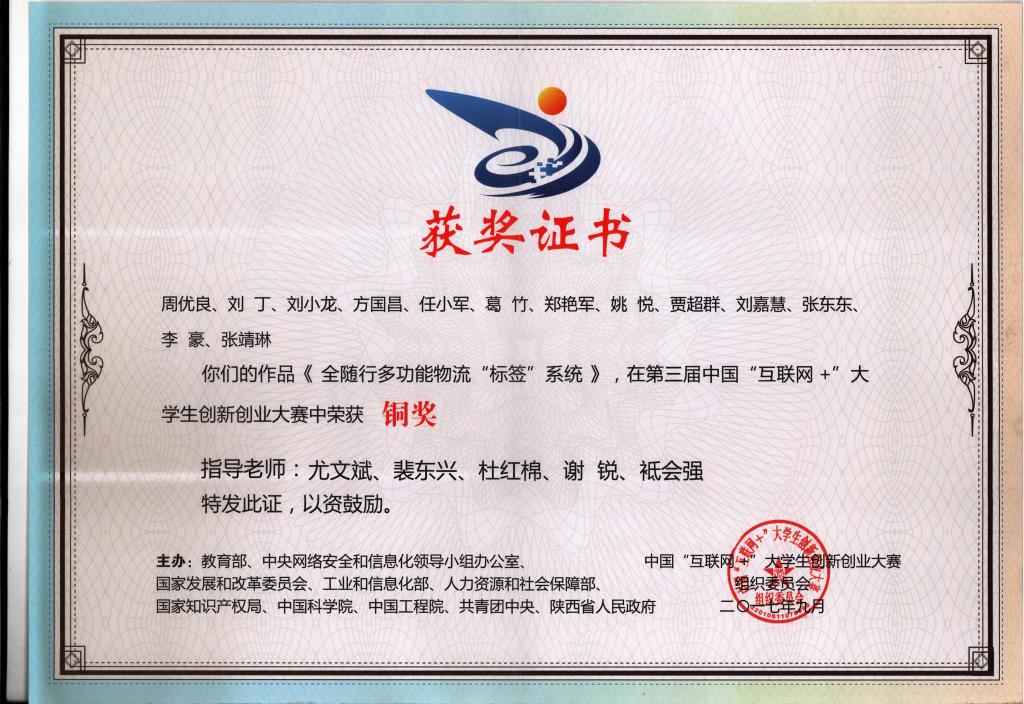 2017年,第三届中国“互联网 ”大学生创新创业大赛,电气工程及智能控制专业教师尤文斌、裴东兴、杜红棉、谢锐指导的“全随行多功能物流标签系统”获得第三届“互联网+”创新大赛国赛铜奖、山西省一等奖。