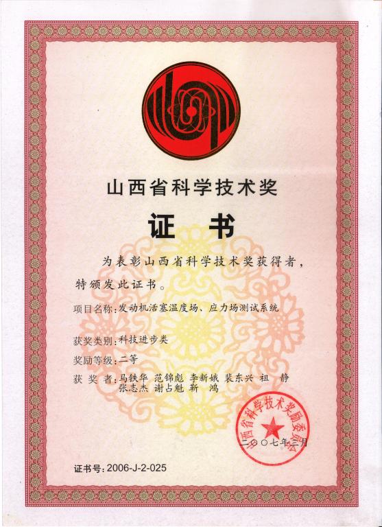 “发动机活塞温度场、应力场测试系统”获得山西省科技进步二等奖;成果完成人:马铁华、范锦彪、李新娥、裴东兴、祖静、张志杰、谢占魁、靳鸿。