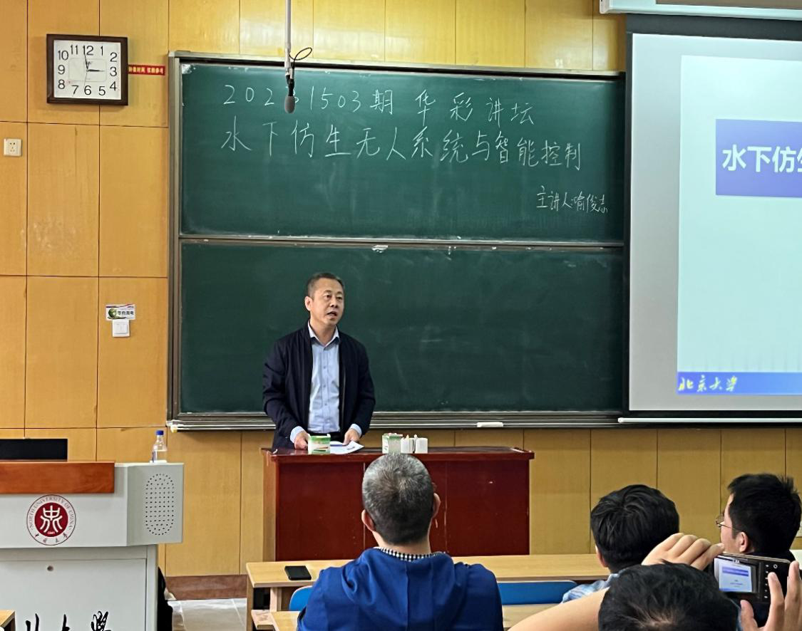讲座伊始,喻俊志教授首先做了详细的自我介绍,本次讲座在热烈的掌声中拉开帷幕。接着,喻俊志教授介绍了侧重水下无人潜航器及水下仿生机器人开发与控制研究进展,主要包括鱼类推进机理及高机动仿生实现、海豚建模与仿生技术、水下视觉环境感知及机动型无人监测系统,并对未来研究方向和工作重点进行分析和展望。