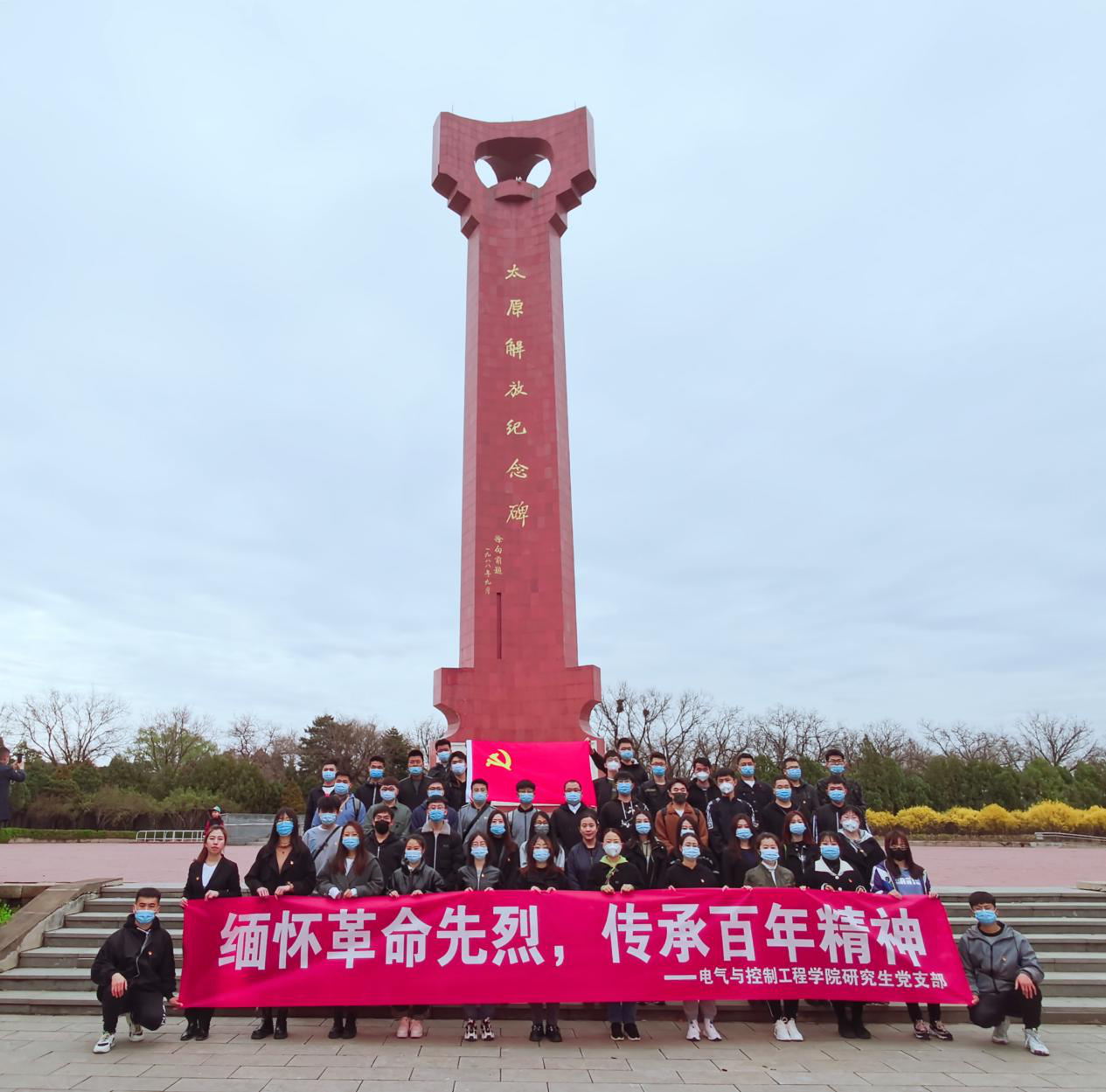 本次活动由学生党员潘丽主持,全体人员在庄严肃穆的太原解放纪念碑前奏唱国歌,接着,在纪念碑前默哀致敬,并献上了鲜花,表达了对先烈们的无限怀念和深深敬意。