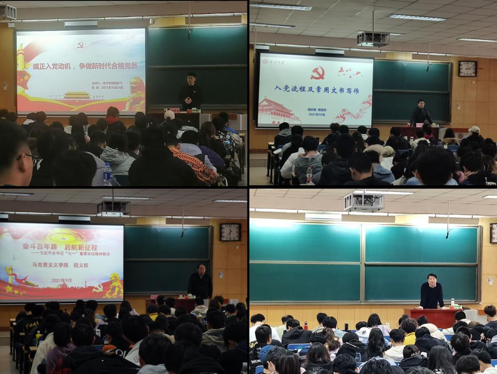 党委副书记杜苇、艺术学院党委书记栗秀萍、信息与通信工程学院党委书记曹凤才、艺术学院党委副书记田维飞、校党委组织部杨宝东、马克思主义学院党委书记段义权、马克思主义学院阚先学八位教师分别进行了《中国共产党的奋斗历程和优良传统》《强化服务意识,践行党的宗旨》《党的组织原则和纪律》《党的光辉历程》《端正入党动机,争做新时代合格党员》《入党手续及常用文书写作》《奋斗百年路,启航新征程——习近平总书记“七一”重要讲话精神解读》《坚持中国特色社会主义的历史必然性》专题授课。